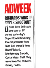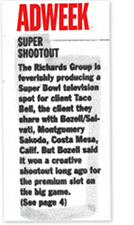While we were shooting, Adweek broke the news that we were vying to replace Bozell’s spots on the Super Bowl. (See article to right.) The Taco Bell client wavered until the last minute, unsure if our spots would finish in time. They did.